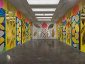 On a larger scale, Milhazes uses light and colour to alter the surrounding architecture, as in public commissions such as Peace and Love (2005), a site-specific installation for the London Underground, where the arches of Gloucester Road Tube Station are filled with dazzling visual cadences in the tradition of stained glass. Similarly, her ‘window paintings’, in which vinyl adhesive cutouts are applied to glass, have a transportive effect – at the Estação Pinacoteca in São Paulo, as part of her major retrospective in 2008; at the Fondation Cartier in Paris in 2009; and at the Long Museum in Shanghai in 2021. Yellow Flower Dream (2018), was created for Benesse Art Site on the island of Inujima, at the Naoshima Art House Project, Japan: a pavilion-like structure, designed by Kazuyo Sejima, comprising seventeen panels, it offers multiple viewpoints into a yellow-tinted world.