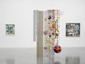 Milhazes extends a certain defiance of gravity in sculpture. At over two metres high, the mobile works Marola, Mariola and Marilola (2010–15) are hung from drawings cut out of metal discs, which also form a kind of ‘ceiling’. Featuring characteristic motifs of the circle, the flower and the arabesque, they combine found and made materials, strung along fine, vertical threads, cascading to the floor like the beaded curtains associated with a hot climate. Like screens or dividers, the sculptures reveal and conceal, agitating the background and drawing attention to the very process of perception. Their shimmying layers can be traced back to Milhazes’s stage design for the dance production Tempo de Verão (2004), choreographed by her sister, which was conceived as a stringed chandelier floating above and in tune with the performance. The idea developed into the series of suspended Gamboa sculptures, from 2008. Executed by artisans of samba schools in Rio New, elements recycled from previous Carnival parades dangle at fixed points down the strings, cumulatively creating a cloud-like balance between weight and volume.