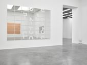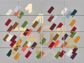 Recent multi-panel paintings, such as Almond’s new series of works, ‘Inari Chimera’ (2023–24), are installed to create a single, extended composition. ‘Inari Chimera’ comprises a matrix of digits in Helvetica font, each symbol and number fragmented as though a cascade of glitching, digitised time. Running horizontally across its centre, six zeroes appear as faint, waning moons, each formed of thin strips of gold. Echoing the titular ‘chimera’ that remains unknowable, these zeroes evoke the integer’s spiritual dimension in that, for Almond, the zero is ‘the nothing that holds everything together’. Across the artist’s large-scale painting, sculpture, photography and moving image, Almond maintains a deliberately ambiguous and enigmatic enquiry into the means by which we think, experience and relate to time.
