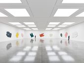 Knoebel first began making paintings in the 1960s with the basic organising principle of thick or thin vertical lines drawn at variable distances from each other. Between 1966 and 1973 he produced around 250,000 A4 drawings in pencil line, which he exhibited in six high and narrow steel cupboards, hermetically sealed and accessible only on demand. Fascinated with the conceptual exercise of dematerialising the medium of painting, Knoebel produced numerous works wherein lines or rectilinear shapes were simply projected onto internal or external walls of buildings. This radical approach to painting eventually became a series of black and white abstract works that played with combinations of rectangular forms. Since the mid-1970s, and especially following the death of his friend Blinky Palermo, Knoebel began to systematically experiment with colour, the expansive painting series 24 Farben – für Blinky (1977) marking the beginning of this process. During the 1980s, he started incorporating found objects into his installations; the installation Eigentum Himmelreich (1983) dedicated to Giese (1942–74) is one such example and comprises 17 separate objects including sculptures made of used wood, reliefs, painted wall panels and framed drawings.