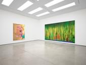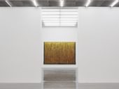 The ‘Orbiter’ paintings are a series of close-up, abstracted images originating from stills of a performer in a shimmering gold sequined dress, in which the very subject appears to break down and dissolve into mere particles of reflected light. Their light-emitting splendour draws a link between the glamour and spectacle of pop performances and the presence of gold in religious painting, used to denote the divine. Equally, in Host (2020), which reworks a detail from Fra Angelico’s painting The Mocking of Christ (1440–41), a detail of St Dominic with halo is dappled and diffused through myriad specks of coloured light. Pursuing a sense of dissolution to its limit, Giovanelli disrupts easy visual recognition in several works by adding tiny scattered accents of pigment onto the image surface, creating an agitated and ambiguous pictorial effect.
