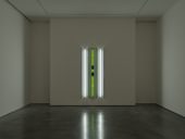 In 1970, Irwin abandoned the studio altogether, and – untethered from two or even three dimensions – started making art in response to a particular site, switching his focus to energy and process rather than material and object. A catalyst to this new approach was his participation, in 1968, in the ground-breaking Art and Technology programme at Los Angeles County Museum, which placed him in dialogue with NASA scientist Ed Wortz and artist James Turrell; as a result of the collaboration, Irwin radically shifted his practice toward non-objective forms. In what he referred to as ‘spatial drawing’, Irwin started employing light, string, tape and scrim to encourage the artwork to sublimate within architecture: taping the floor to connect the walls (Black Line Volume, 1975–76); installing fluorescent lights to articulate a multi-levelled ceiling (Three Plane Triangulation, 1979); suspending a grid of translucent white screens over the internal windows of an atrium (48 Shadow Planes, 1983); or placing reflective panels of single colours over floor and ceiling (Who’s Afraid of Red, Yellow & Blue, 2006–07). Art and situation merge to captivating effect in the installation 1° 2° 3° 4° (1997), which exploits the wraparound windows of the Museum of Contemporary Art San Diego, with their panoramic ocean outlook. Three rectangular apertures are cut into the tinted glazing, highlighting the postcard views, but the actual openings also allow the sea air and natural light to enter the space. The fourth degree of the title refers to time, to the viewer’s ever shifting experience as conditions mingle and change.